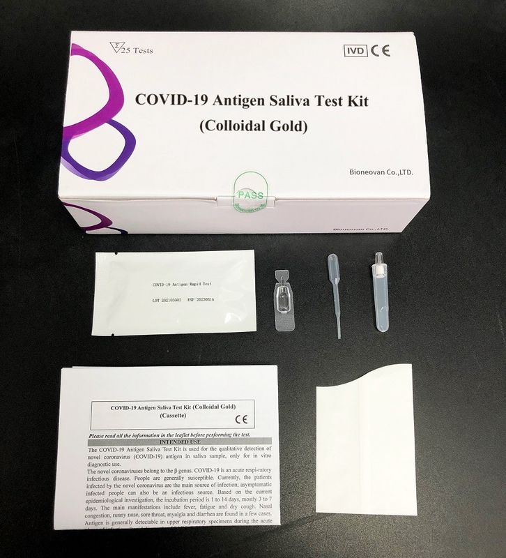 COVID-19 Antigen Saliva Test Kit, sadece in vitro teşhis kullanımı için tükürük örneğinde yeni koronavirüs (COVID-19) antijeninin kalitatif tespiti için kullanılır.